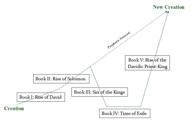 While I have focused so far on Book I, because that is where I think this hyperbolic-prophetic pattern to David’s life and writings are most pronounced, it can be seen periodically throughout the psalter. Consider especially Psalms 43, 68, 69, 72, 108–110, 118, and the Psalms of Ascent as a corpus (Pss. 120‒134). Moreover, as a whole the psalter appears to be structured according to this same pattern: (1) through death and resurrection (2) into the presence of God (3) to the end of international and cosmic renewal.